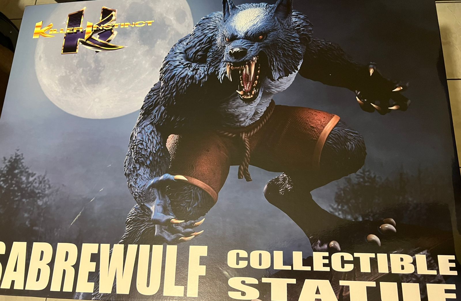 La estatua a escala 1:4 de Sabrewulf mide 44 cm de alto y 42 cm de ancho. El licántropo se agacha sobre una base esculpida que imita madera deformada y podrida, llena de arañazos y huesos. Este coleccionable de videojuego incluye dos pares de brazos: las extremidades del hombre lobo, cubiertas de pelaje azul, y sus brazos cibernéticos dorados. El logo de Killer Instinct en la base está fijado magnéticamente, lo que permite a los coleccionistas exhibir la estatua con o sin él.