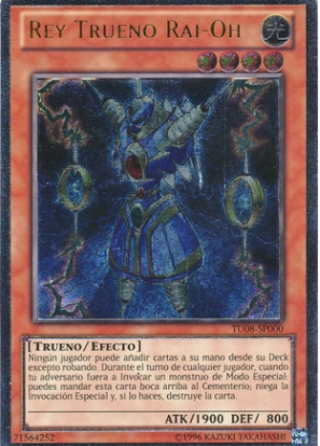 Rai-Oh, Rey del Trueno – TU08-EN000 es una carta promocional de Yugioh de la colección Turbo Pack 8 TU08. Esta carta es una Rara Definitiva. Yugioh comenzó a mediados de los 90 como un corto semanal en la Shonen Jump; para 1999, el juego de cartas coleccionables (TCG) se lanzó en Japón. Yugioh se ha convertido en uno de los juegos de cartas más populares del mundo y ya ha superado los 20 años de juego competitivo a nivel mundial.
